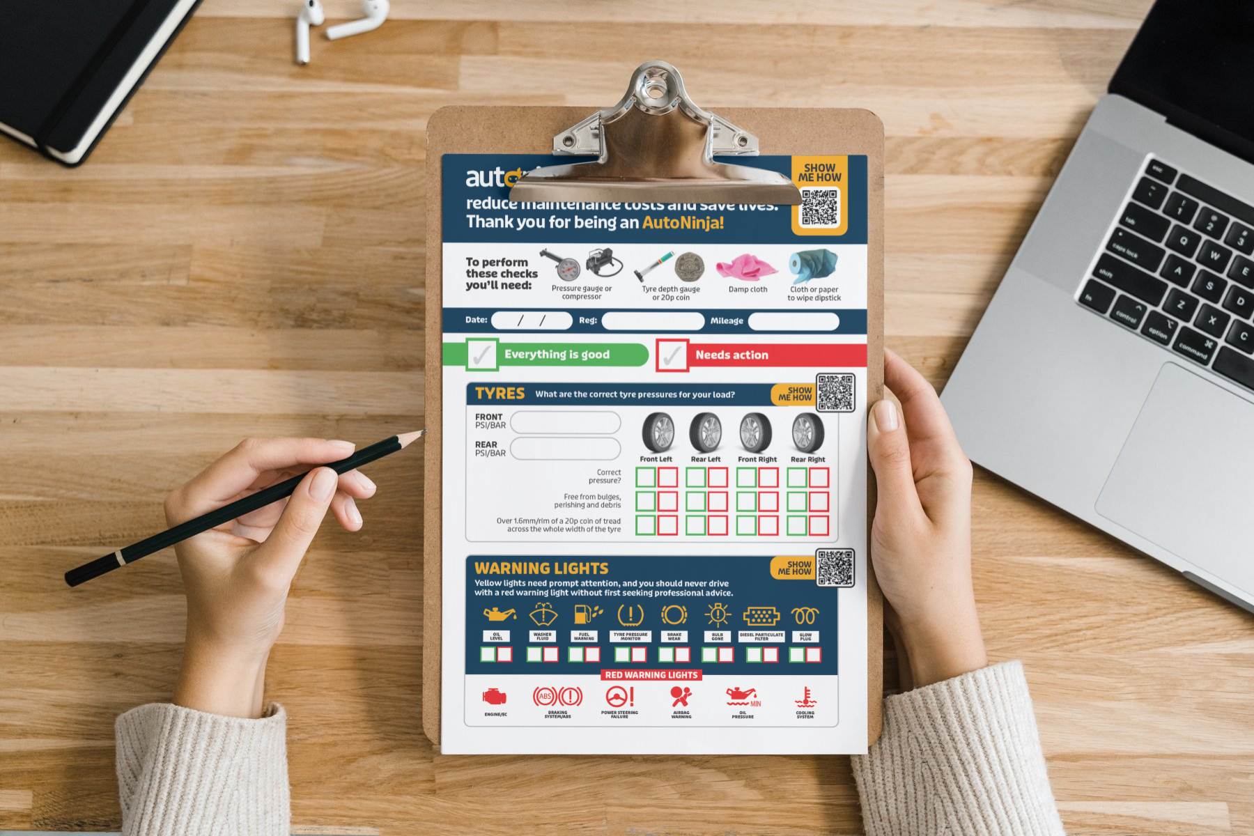 Using the AutoNinja checklist, you can check your tyres, lights, oil, warning lights and windscreen condition in around 10 minutes - no mechanical knowledge needed. If you're not sure how to do a check, scan the QR code on your checklist and a short video will walk you through it.